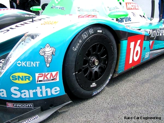 guess is that they are a drag reduction device. | >>Grid shots show the Pescarolo LMP with RS Spyder type front wheel covers. |  | >>Sam