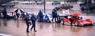 During the extended yellow period to remove Wayne’s car, we brought Rich in for a driver change and to top off the fuel. Jim got in and resumed behind the yellow. At this point during the caution the order re-shuffled do to pit stops and the pace car was letting cars back on the lead lap while trying to find the leader. For whatever reason our car wasn’t let by. Hence we were eventually led to the checker by a group of slower GT2 and GT3 cars that were on the lead lap. The Kudzu was again 5th in line for the restart, behind the leading #16 Riley & Scott, #5 Panoz GTR, #20 Riley & Scott, and the many laps down #5 Panoz. The lead two cars rocketed away as they were still fighting for position. But they were followed by their counterpart sister cars. But the amazing thing is that Jim pulled away too. The R&Ss and Panozs pulled from him, but the Kudzu pulled away from the rest of the pack led by the #8 Schubot/Camferdam Ford R&S. It's too bad we were a lap down! I didn’t have a watch to put on Jim, but his lap times were slightly slower than the Panozs and R&Ss, but faster than the rest of the field. Despite Jim’s speed and our car’s advantage in the rain, we still only finished twelfth. If the rain had continued and the race had longer periods of green racing we would have been able to stretch our advantage of only one stop for tires as we would have only had to stop for fuel from there on out. The light Kudzu being easy on tires in the rain. So a GT1 car finally won overall. Considering the conditions and the circumstances of the race I bet the Panoz camp is grateful to have the win, but also wanting to prove more than ever that they can win under normal circumstances. Next stop Petit Le Mans. |